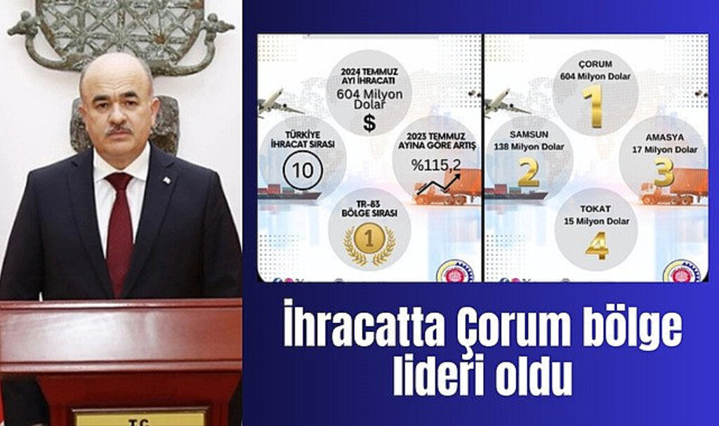 Ticaret Bakanlığı'nın verilerine göre Çorum, Temmuz ayında İstanbul'dan sonra ihracatını artıran 'ikinci il' olurken, TR 83 Bölgesi'nde zirvede yer aldı. Vali Doç. Dr. Zülkif Dağlı, "İhracat hedef çıtamız sürekli artacak" dedi.