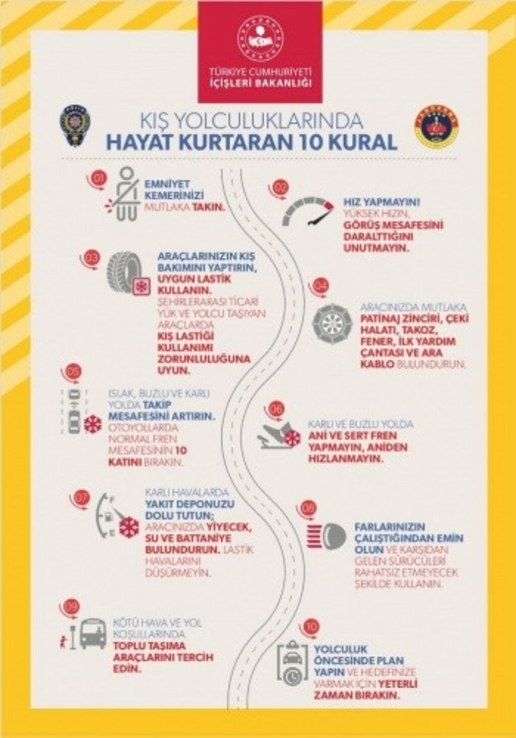 İçişleri Bakanlığı tarafından hazırlanan görselde, "Kış Yolculuklarında Hayat Kurtaran 10 Kural" konusu anlatıldı.