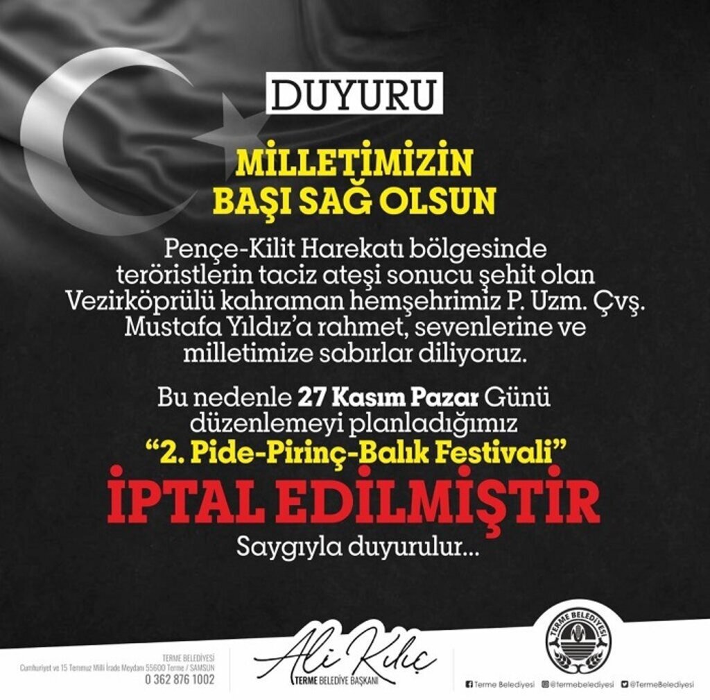 Terme Belediyesi tarafından pazar günü yapılması planlanan "2. Pide-Pirinç-Balık Festivali" şehit haberinden ötürü iptal edildiği açıklandı.