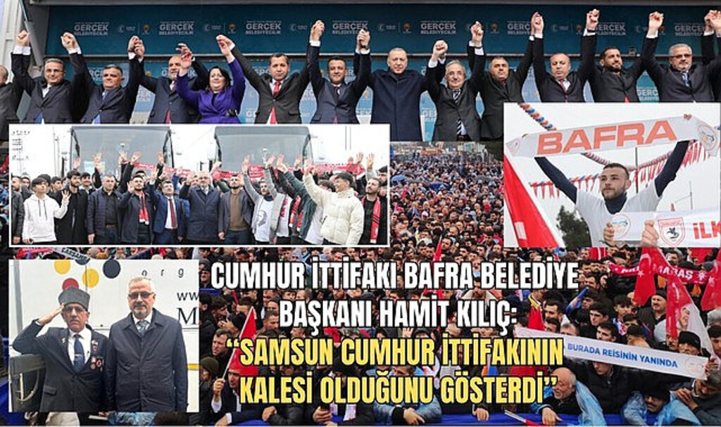 Cumhur İttifakı AK Parti Bafra Belediye Başkan Adayı Hamit Kılıç, “Türkiye Yüzyılı’nın öncüsü Cumhurbaşkanımız ve Genel Başkanımız Sayın Recep Tayyip Erdoğan’a Samsun’umuzda gösterilen yoğun ilginin Cuma günü Ordu, Giresun, Cumartesi Rize ve Pazar günü Trabzon'da da devam edeceğine yürekten inanıyorum. Karadeniz her zaman liderinin yanında olmuştur, olmaya da devam edecektir” şeklinde konuştu.