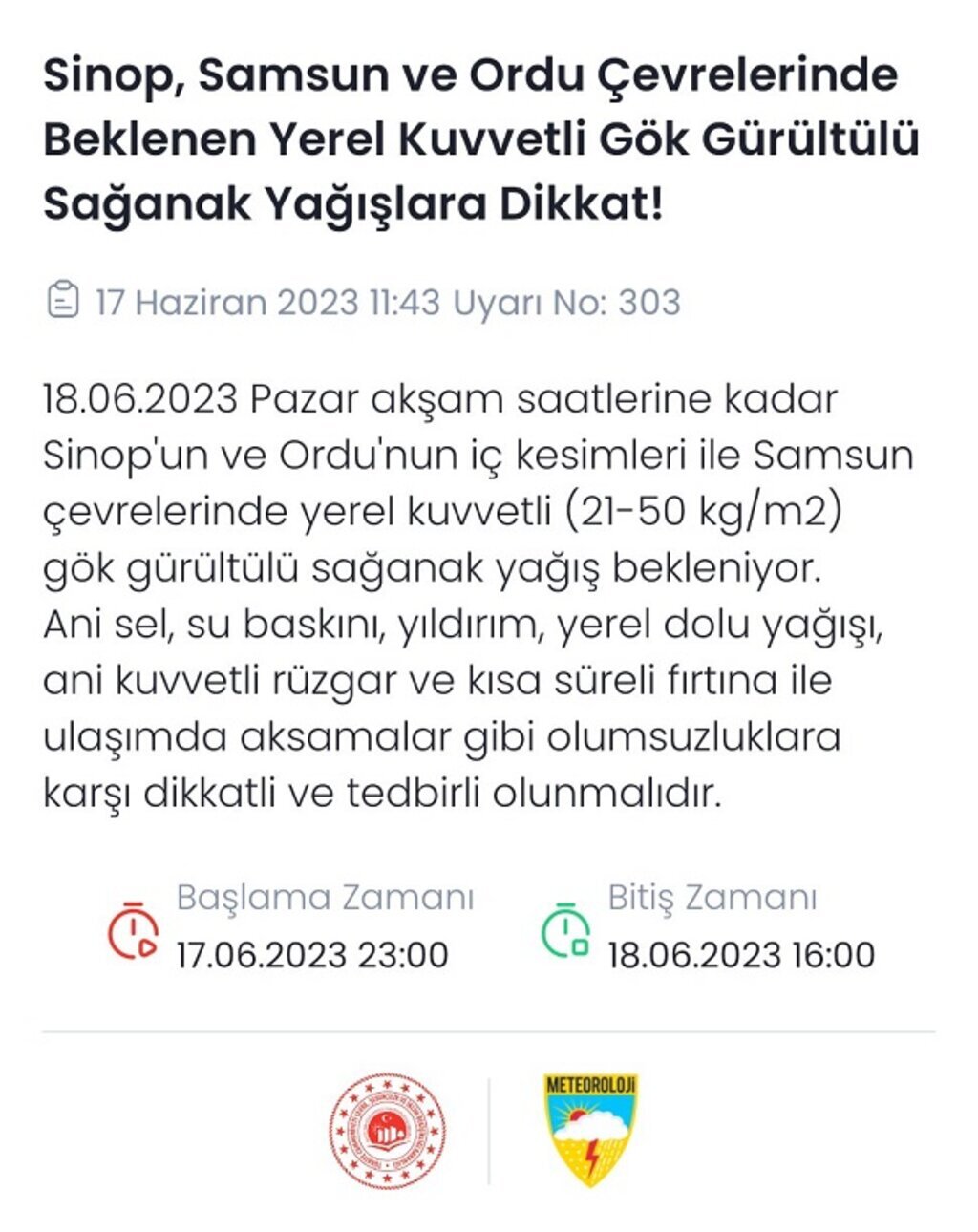 Samsun Sel Haberleri - Konuyla ilgili olarak Samsun Valiliği sosyal medya hesabından Meteoroloji Genel Müdürlüğü'nün uyarısını paylaşarak, "Meteorolojik Uyarı Sinop, Samsun ve Ordu Çevrelerinde Beklenen Yerel Kuvvetli Gök Gürültülü Sağanak Yağışlara Dikkat!" mesajını verdi.