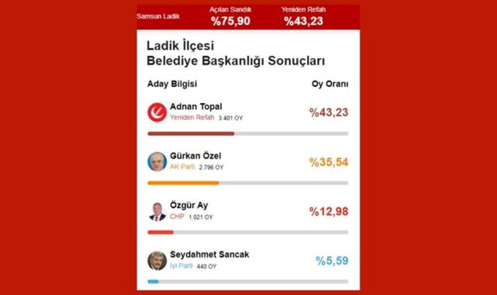 Samsun'da 31 Mart Pazar günü Ladik Belediyesi Başkanını belirlemek için seçim yapıldı. Ladik Belediyesi 31 Mart yerel seçim sonuçları açılan sandık yüzdelerine göre değişiklik göstermekte olup anlık seçim güncellemesi yapılacaktır.Ladik Belediyesi Seçim Sonuçları: